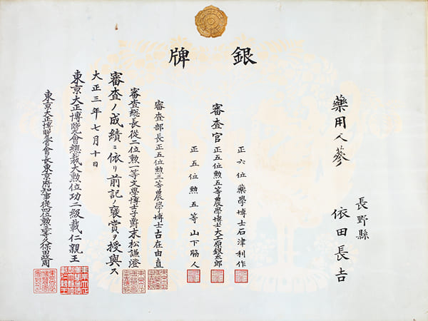 一代目 依田長吉:信州で高麗人参を栽培し、加工を行う 横浜の中華街にて輸出も行う。東京大正博覧会(1914年大正3年)、に自社で栽培した高麗人参を出品し長野県の部で賞状を皇族閑院宮載仁親王殿下より拝領する。